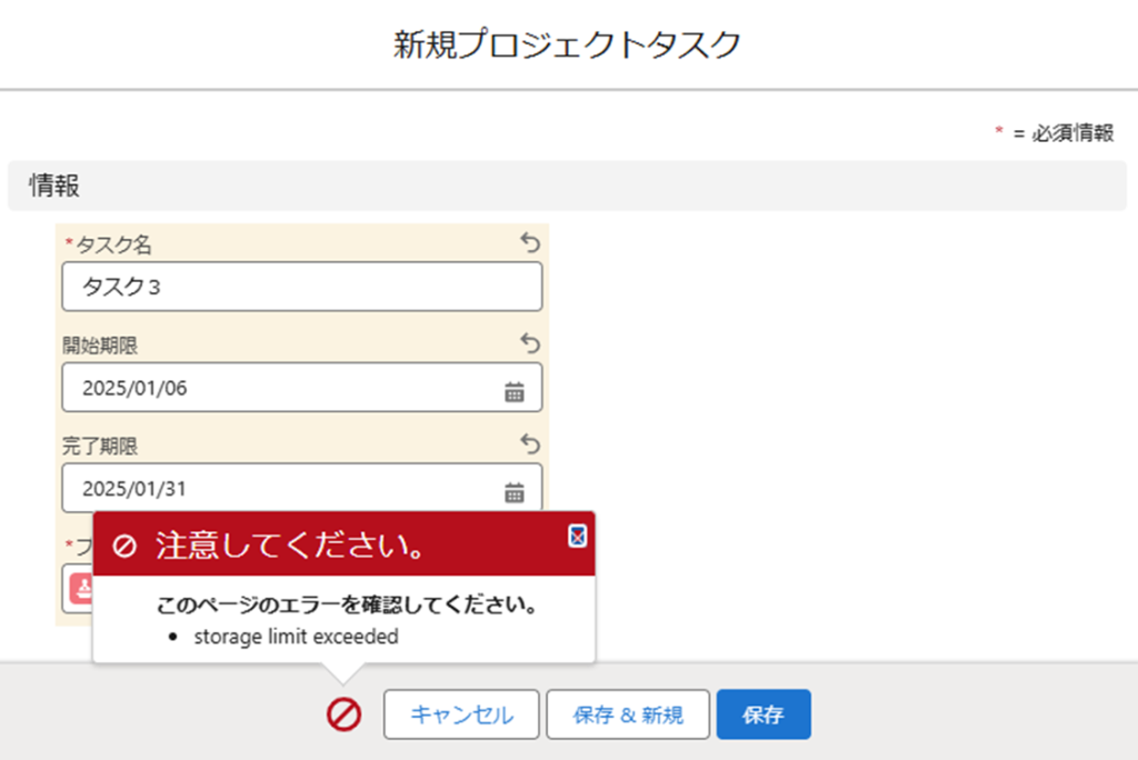 以下のようにファイルストレージの容量をオーバーした場合、新たにファイルをアップロードした際にエラーとなり、ファイルを追加することが不可能となります。